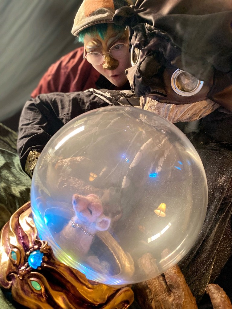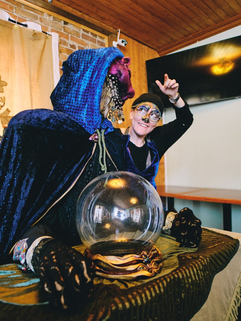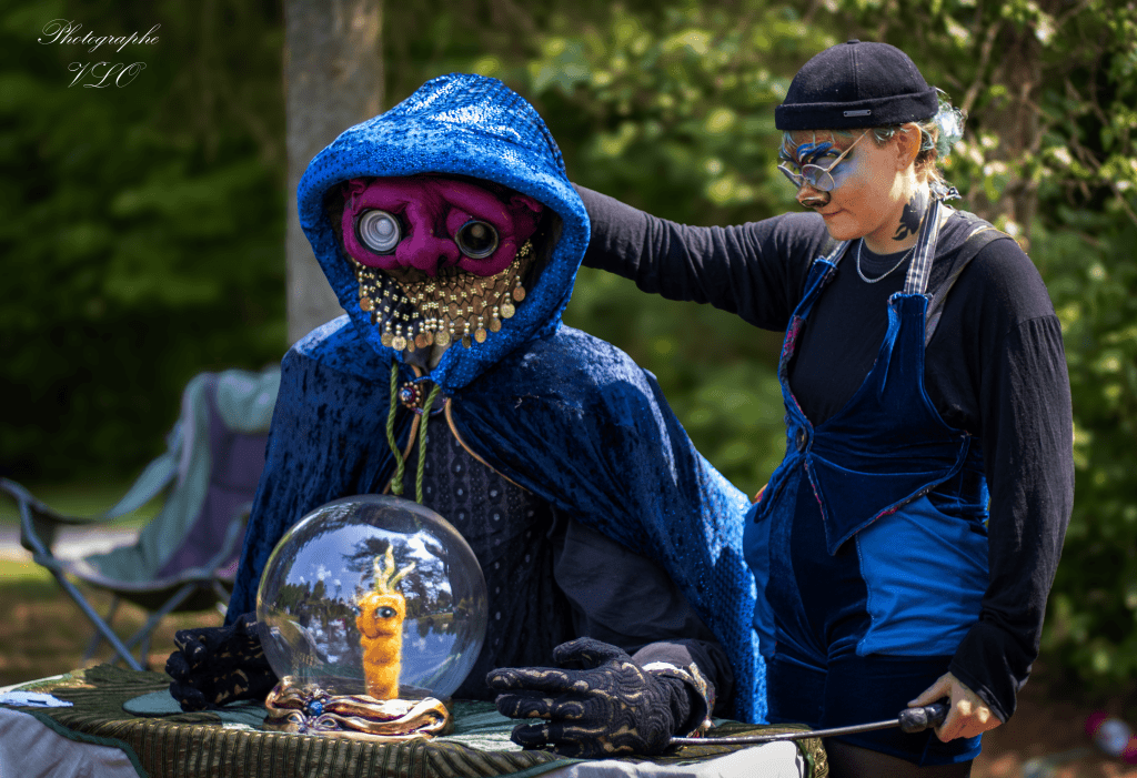 Ces visions sont orchestrées par une colossale voyante, venue d’un monde parallèle qu’on nomme Subvertige. Son visage, effacé sous un masque, laisse deviner un âge incalculable. Derrière elle, son apprenti, fasciné, se dévoue à percer les mystères de cette magie.
