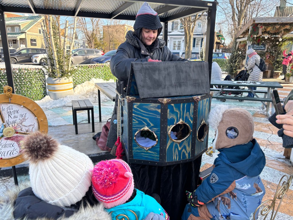 Enchanté! illumine les marchés, les files d’attente pour le Père Noël, les événements des fêtes, un petit groupe de spectateurs à la fois.